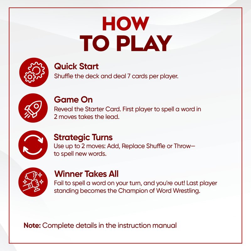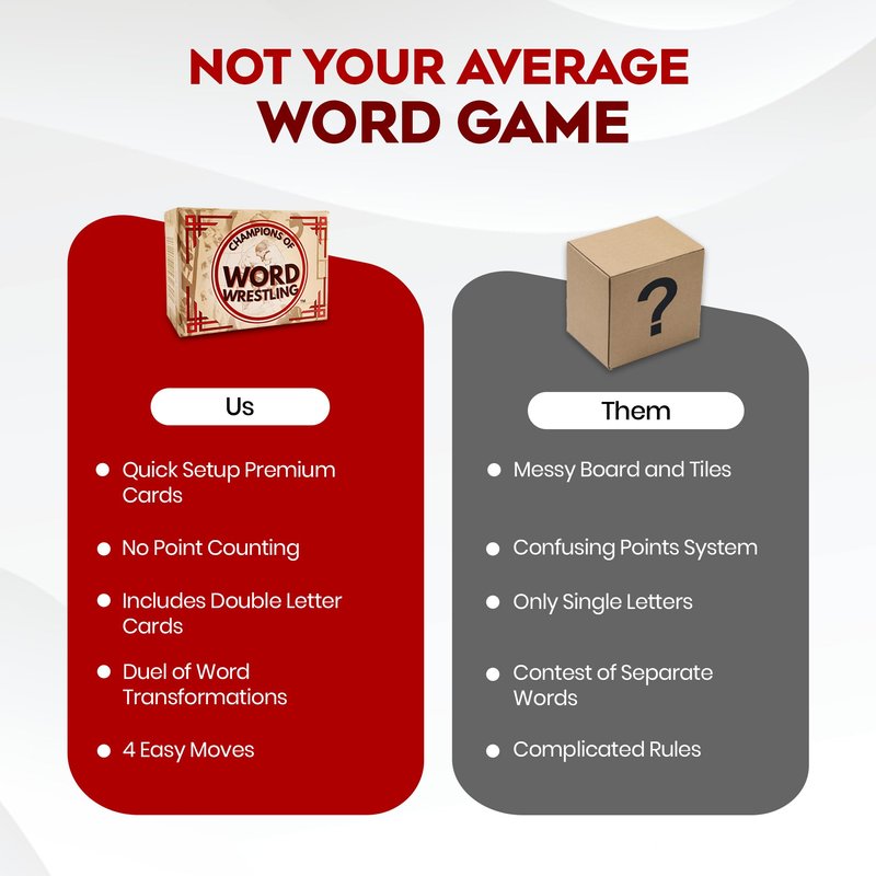 - 𤼠JUMP RIGHT IN! EASY, COMPETITIVE GAMEPLAY: Word Wrestling is the ultimate word card game thatās perfect for everyone, whether you're a fan of adult word games or searching for simple word games for kids 8-12. With easy-to-learn rules, itās the ideal choice for family card games or head-to-head challenges for two players. Bring excitement to every game night with this engaging and fast-paced competition!