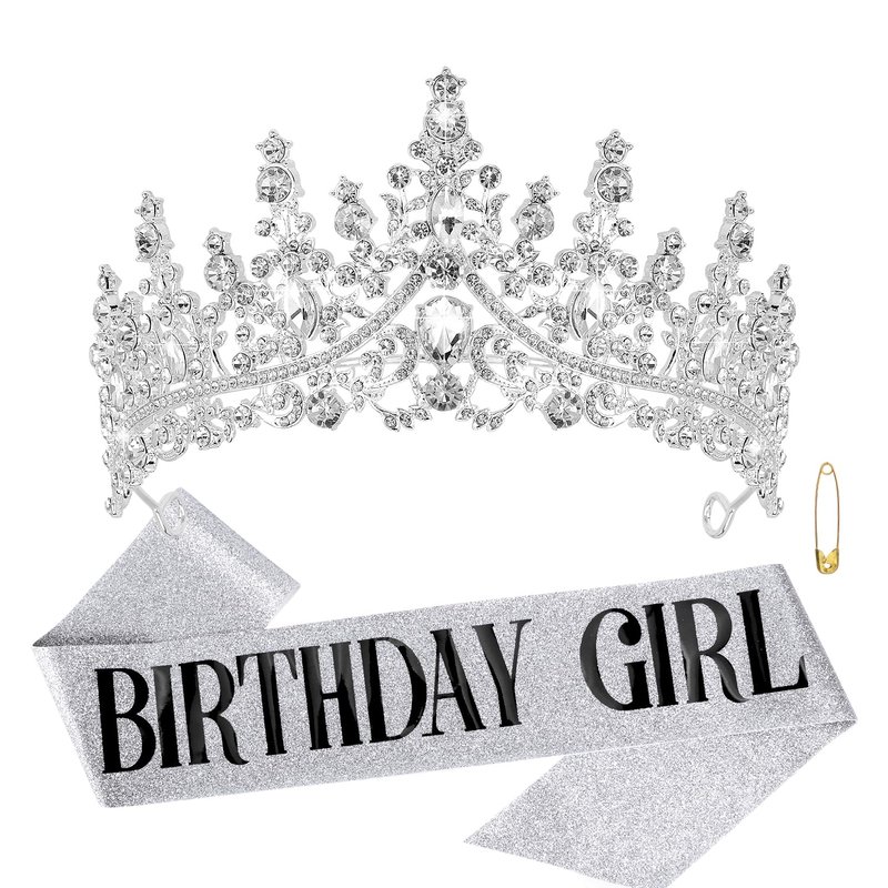 CHANACO Birthday Crown Tiaras for Women Birthday Girl Sash Silver Crystal Birthday Tiara Rhinestone Birthday Headband Princess Crown for Girls Hair Accessories Happy Birthday Party Decorations