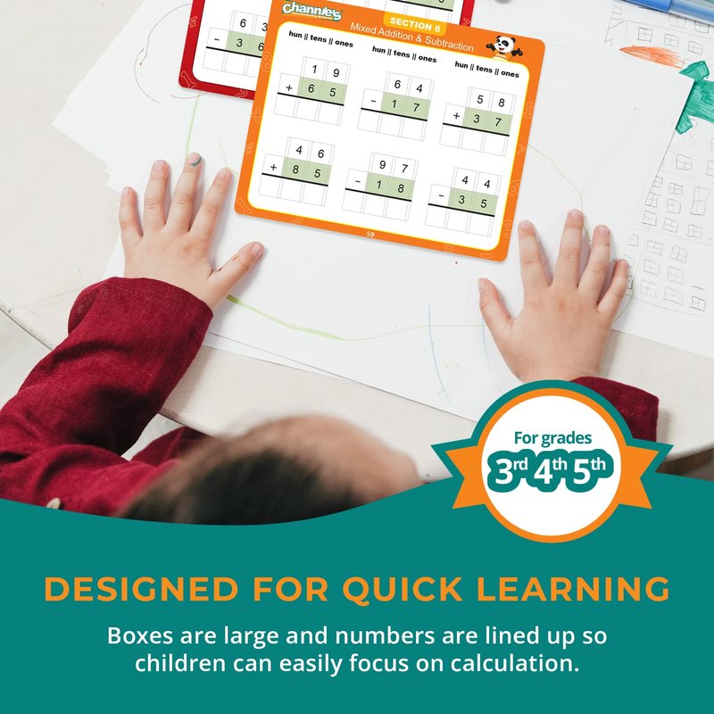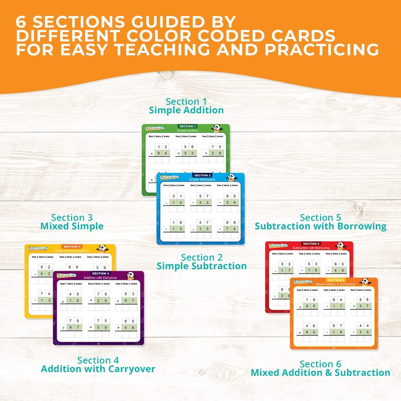 - Reinforce Children’s Basic Math Skills: Channie's Double Digit Addition and Subtraction Flash Cards include 30 cards; 6 sections with different types of equations; 6 double-digit problems per card; 360 operations for daily practice