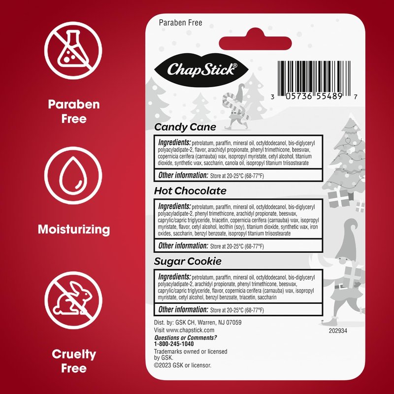 - CHAPSTICK FAN FAVORITE: Celebrate the holiday season all year with three flavored lip balms that combine function and fun: Candy Cane, Sugar Cookie, and Hot Chocolate.