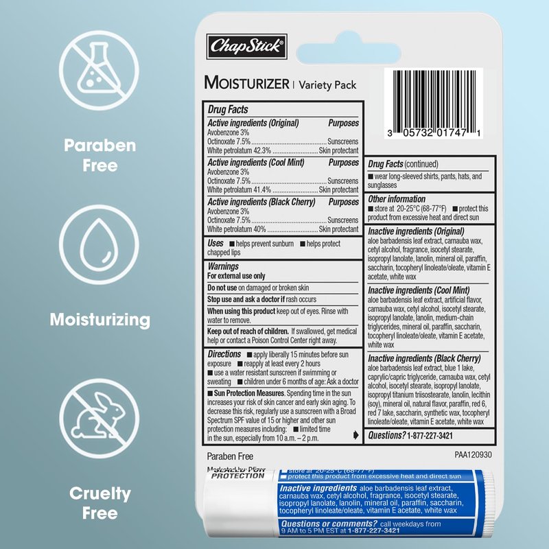 - HYDRATING LIP TREATMENT: This bundle features ChapStick Original Moisturizer 2-in-1 Lipcare (3 tubes) plus Cool Mint (1 tube) and Black Cherry (1 tube) – formulated with broad-spectrum SPF 15 protection.