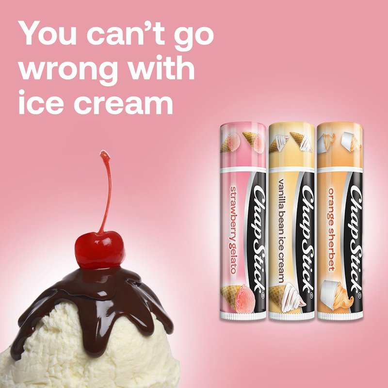 - CHAPSTICK FAN FAVORITE: This collection of moisturizing lip balms includes three yummy ice cream flavors: Strawberry Gelato, Vanilla Bean Ice Cream, and Orange Sherbet.