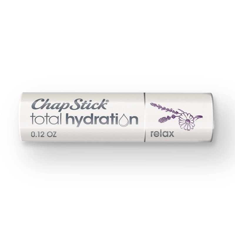 - One 0.12-ounce ChapStick Total Hydration Essential Oils Relax Chamomile + Lavender Lip Balm Tube, Lip Care