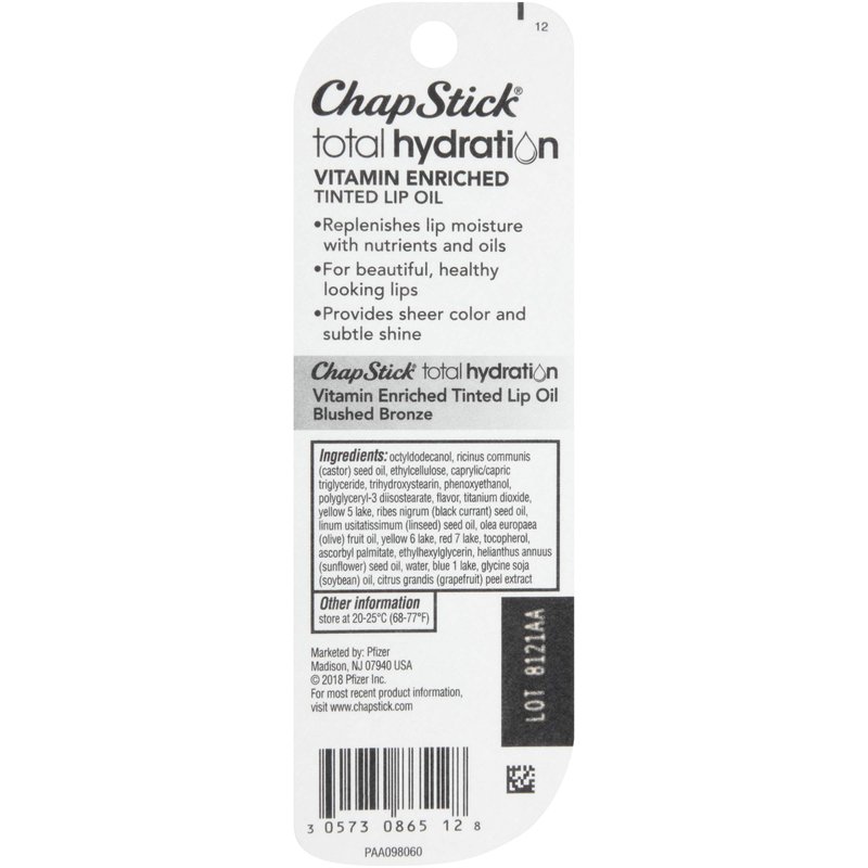 - One 0.24 ounce ChapStick Total Hydration Vitamin Enriched Blushed Bronze Tinted Lip Oil Tube, Lip Care