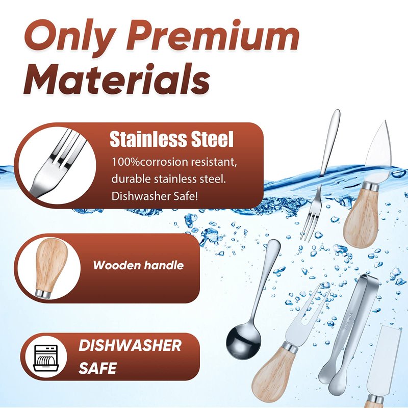 - Quality material: the spreader knives set is made of stainless steel, all tools have a wooden handle except the spoons, serving tongs and forks, they are not easy to rust or break, not easy to bend, can be applied for a long time and many times