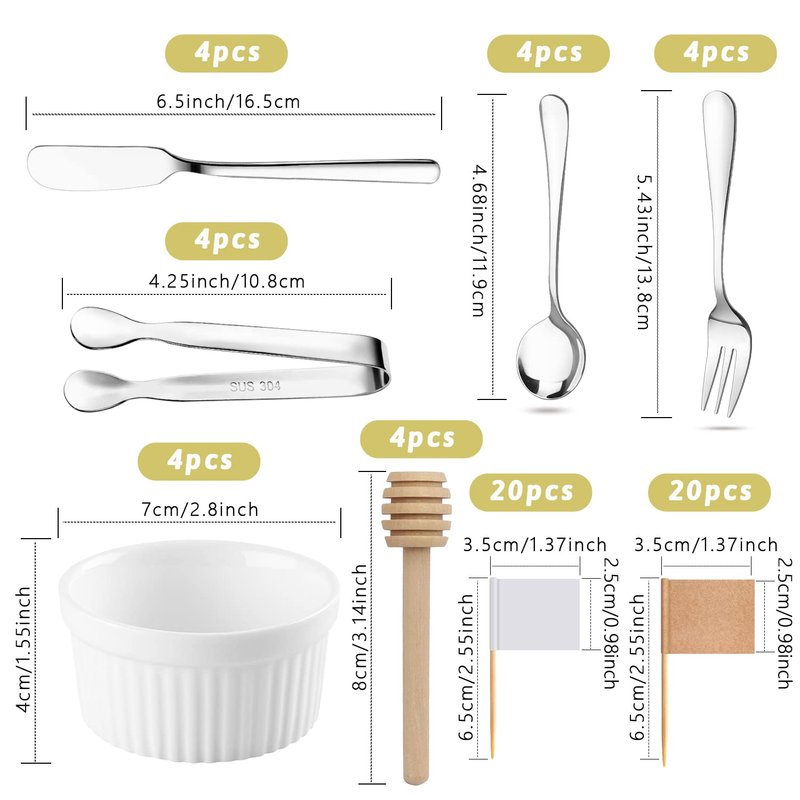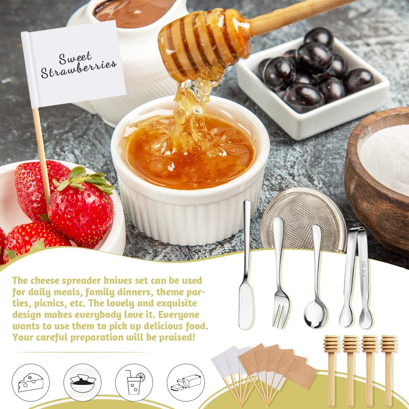 - 【Charcuterie Board Accessories kit】Cheese butter spreader knives set includes 4 cheese knives, 4 mini serving tongs, 4 small spoons, 4 small forks, 4 ceramic dipping bowls, 4 honey dippers and 40 toothpick flags, which are used for cheese, butter, jam, appetizers and pastries making. Enough to meet the needs of daily life and festivals such as Christmas, Thanksgiving.