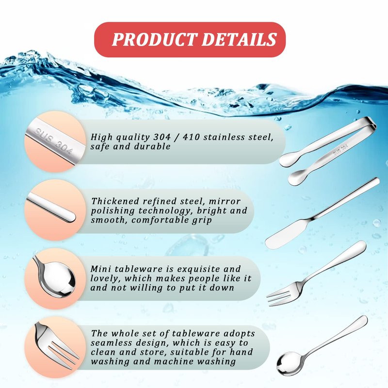 - 【Small and Exquisite Size】Butter spreader knives measure approx. 6.5 inches/ 16.5 cm long, mini serving tongs measure approx. 4.3 x 0.64 inches/11 x 1.6 cm, forks measure approx. 5.34 x 0.7 inches/ 13.5 x 1.8 cm and spoons measure approx. 4.53 x 1.18 inches/ 11.5 x 3 cm, honey dippers measure approx. 3.15 inch/ 8 cm, small ceramic dipping bowls measure approx. 2.75 x 1.18 inches/ 7 x 3 cm, capacity approx. 90 ml/ 3 oz. Exquisite and small size, simple cleaning and convenient storage.