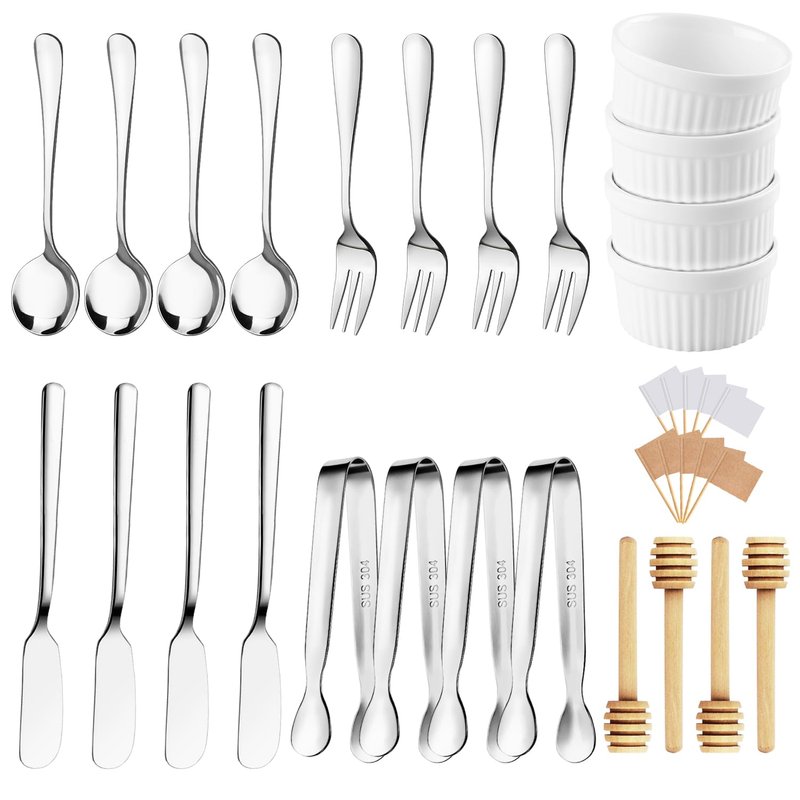 - 【Multifunctional and Easy to Use】Multifunctional butter cheese jam spreader knife, comfortable to hold, seamless integrated process, smooth and safe. Mini serving tongs are made of high-quality stainless steel, which is not easy to bend and deform, and can easily pick up all kinds of delicious food. Mini spoons and forks, easy to hold, use as you like, very convenient. Ceramic dipping bowl can be used to hold a variety of condiments, jam, honey, dessert, etc., widely used.