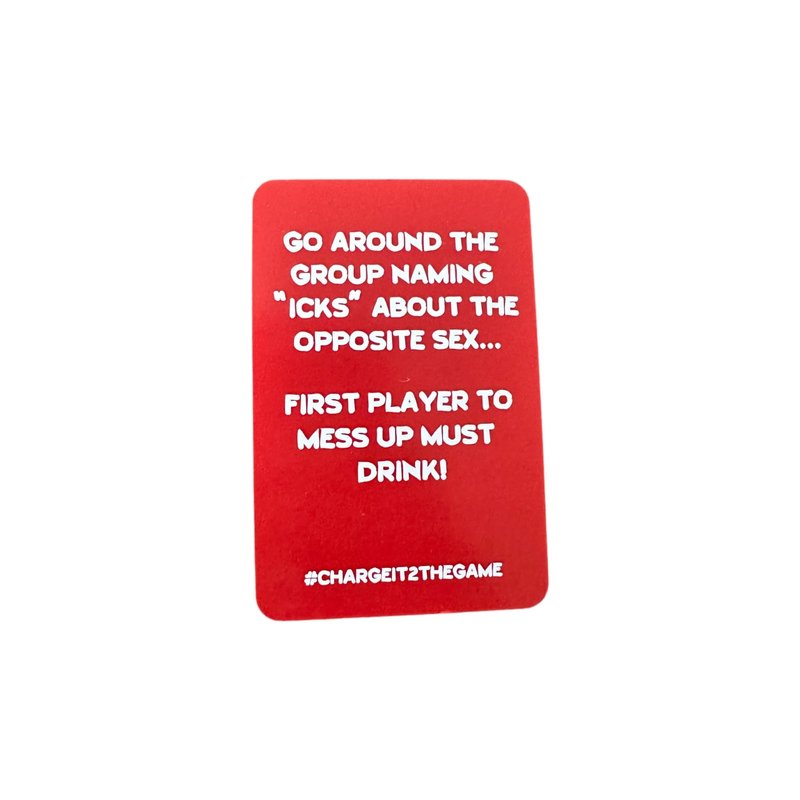 Introducing Charge It 2 The Game Drinking Cards Vol. 3: The Ultimate Party Game for Adults! Get ready to take your party to the next level with Charge It 2 The Game Drinking Cards Vol. 3! Packed with 90 hilarious cards featuring wild dares, fun challenges, and "finish-the-lyrics" prompts, this game guarantees unforgettable fun for any gathering. Whether you’re hosting a bachelorette party, celebrating a 21st birthday, or enjoying a cozy date night, this drinking card game will have everyone laughing, bonding, and creating memories to last a lifetime. These cards are designed to turn any occasion into an epic experience. From girls' nights and holiday parties to vacations and Friendsgiving gatherings, each card brings excitement and energy that keeps the good times rolling. Why spend money on expensive nights out when you can create legendary moments in the comfort of your home with this ultimate party game? With Charge It 2 The Game Vol. 3, the rules are simple, and the fun is endless. Just draw a card, follow the prompt, and let the laughter and camaraderie unfold. It’s perfect for everything from bachelor parties to college parties, and it even works for smaller groups like couples’ game nights or kickbacks with close friends. No matter the event, this adult drinking game delivers unmatched entertainment. Skip the boring games and bring on the dares, challenges, and hilarious prompts that keep everyone fully engaged. Perfect for adults looking for fun and unique ways to celebrate, this game adds energy and excitement to every occasion. Charge It 2 The Game Drinking Cards Vol. 3 is more than just a game; it’s the secret ingredient to making every moment unforgettable. Whether you're planning a night in or throwing a big party, this adult party game has you covered. Grab your deck today and turn up the fun! 🎉