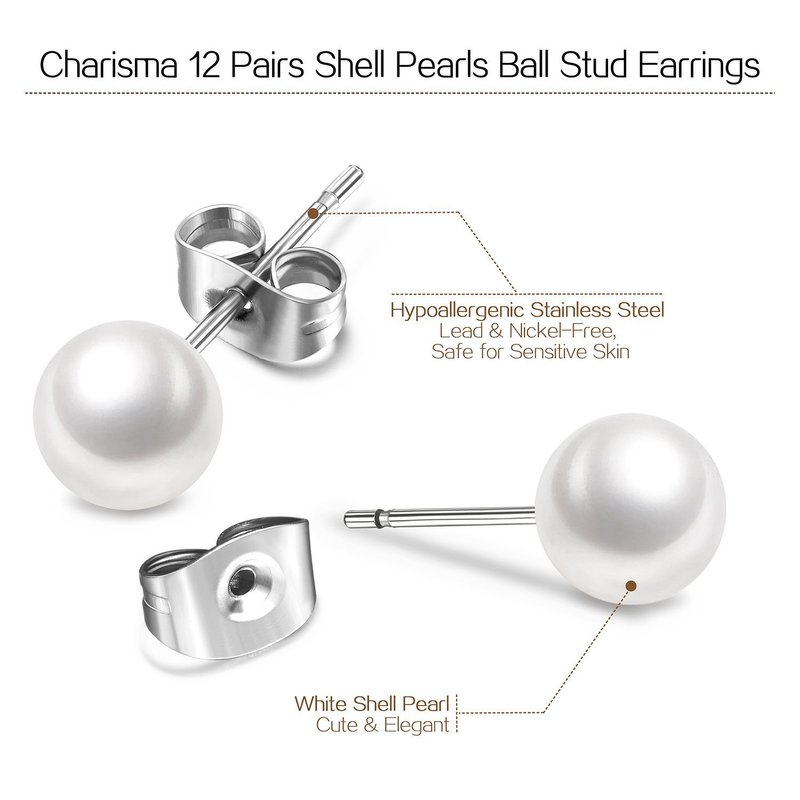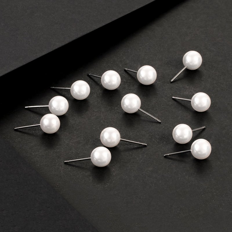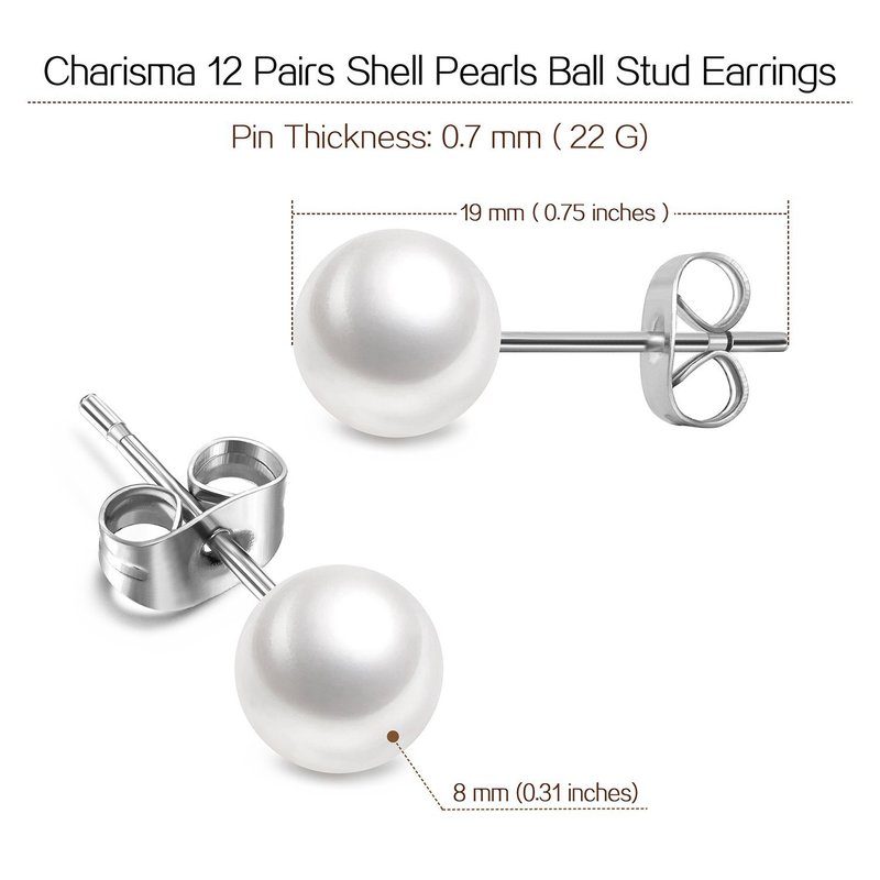 - SIZE, QUANTITY AND COLOUR: There are 12 pairs, with pearl diameter 8mm, with white pearl and sliver pin. Pearl earrings set include different sizes, you can pick the one that suits you. Also, it is perfect for those who have multiple piercing, you can wear more than one size/set at a time.