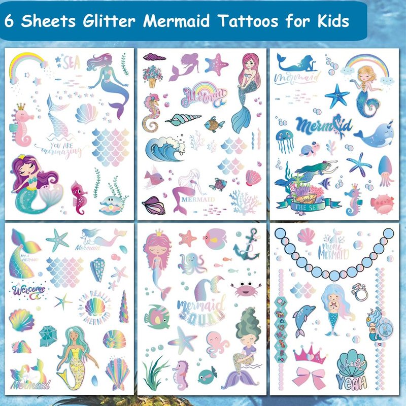 - ⚡6 Large Sheets Glitter Mermaid for Girls Birthday Gifts -- 100 PCS fake mermaid tattoos total in 6 sheets to be easily included in a mermaid birthday party gift bag. Easy to share,even if a lot of people's parties, you can have a different tattoo with others.These adorable tattoos will keep you and your little ones – and their friends – occupied for a while. Great for playdates, parties, or rainy days.