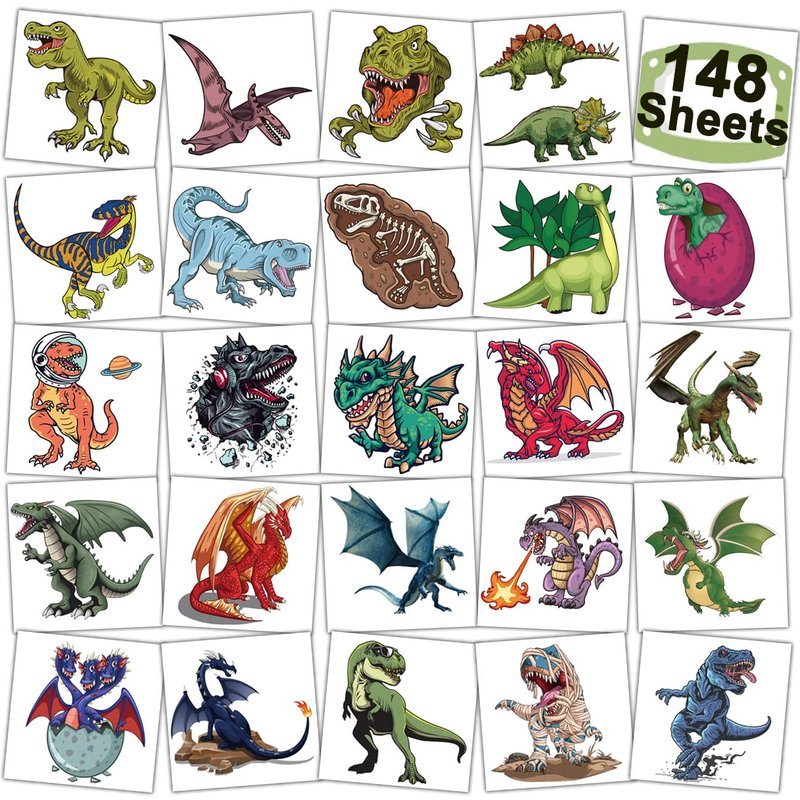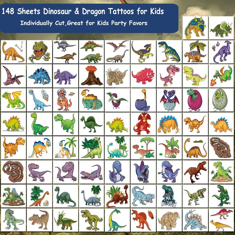 - ⚡Individually Wrapped Sheets No Need to Cut -- 148 PCS dinosaur tattoos individually wrapped to be easily included in a party gift bag or kids stocking stuffers. Easy to share,even if a lot of people's parties, you can have a different tattoo with others.These chic and cool tattoos will keep you and your little ones – and their friends – occupied for a while. Great for playdates, dinosaur and dragon parties.