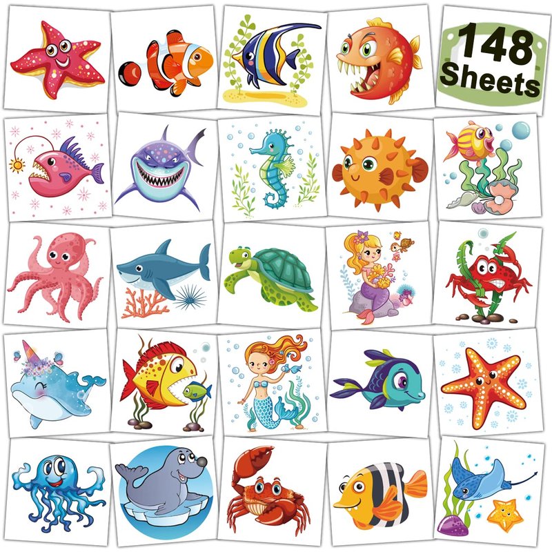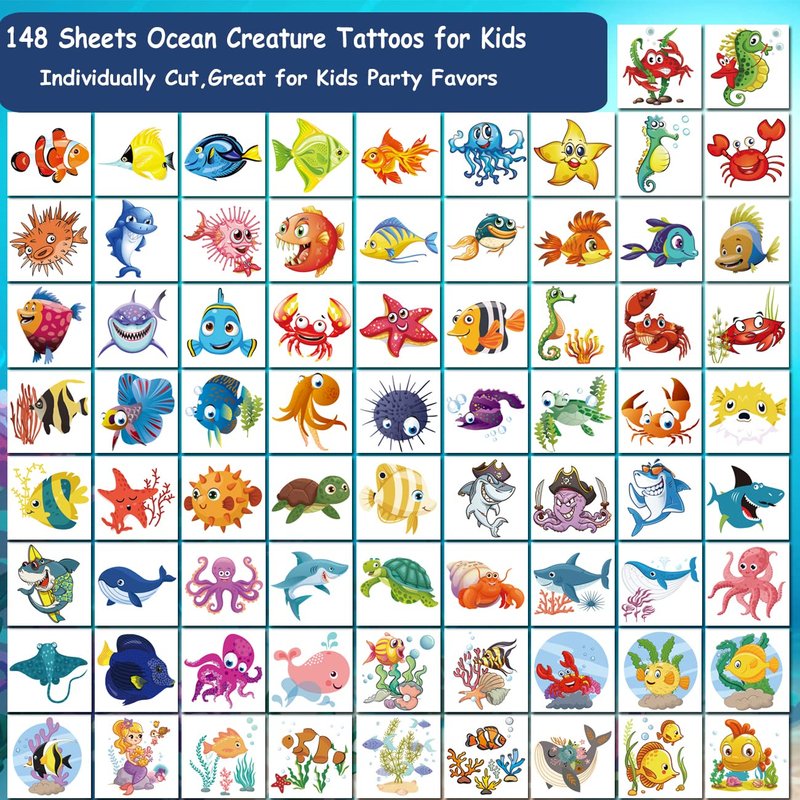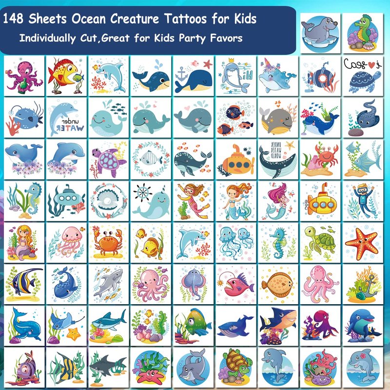 - ⚡Individually Wrapped Sheets No Need to Cut -- 148 Sheets under the sea tattoos individually wrapped to be easily included in a party gift bag or kids stocking stuffers. Easy to share,even if a lot of people's parties, you can have a different tattoo with others.These chic and cool tattoos will keep you and your little ones – and their friends – occupied for a while. Great for playdates, ocean animals parties.
