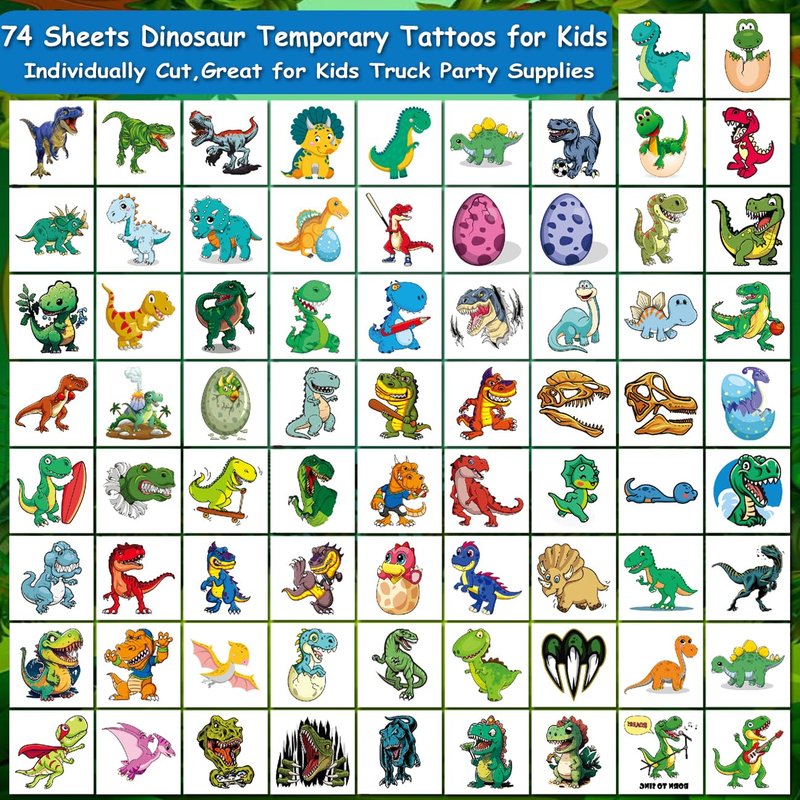 - ⚡Individually Wrapped Sheets No Need to Cut -- 74 PCS dinosaur tattoos individually wrapped to be easily included in a party gift bag. Easy to share,even if a lot of people's parties, you can have a different tattoo with others.These adorable tattoos will keep you and your little ones – and their friends – occupied for a while. Great for playdates, parties, or rainy days.