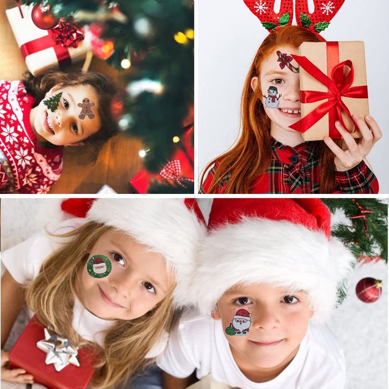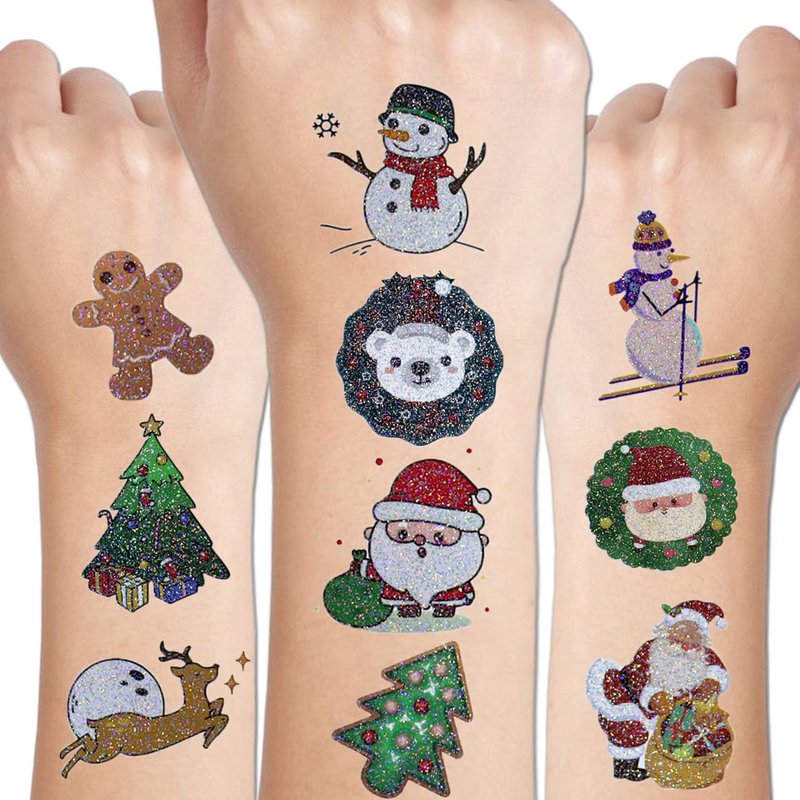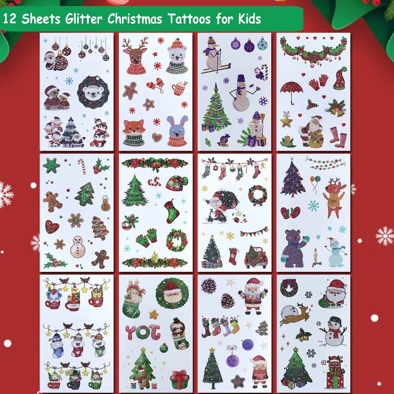 - ⚡12 Sheets Glitter Xmas Tattoos -- 93+ Christmas tattoos total in 12 sheets to be easily included in a party gift bag. Easy to share,even if a lot of people's parties, you can have a different tattoo with others.These adorable tattoos will keep you and your little ones – and their friends – occupied for a while. Great for playdates, Christmas parties.