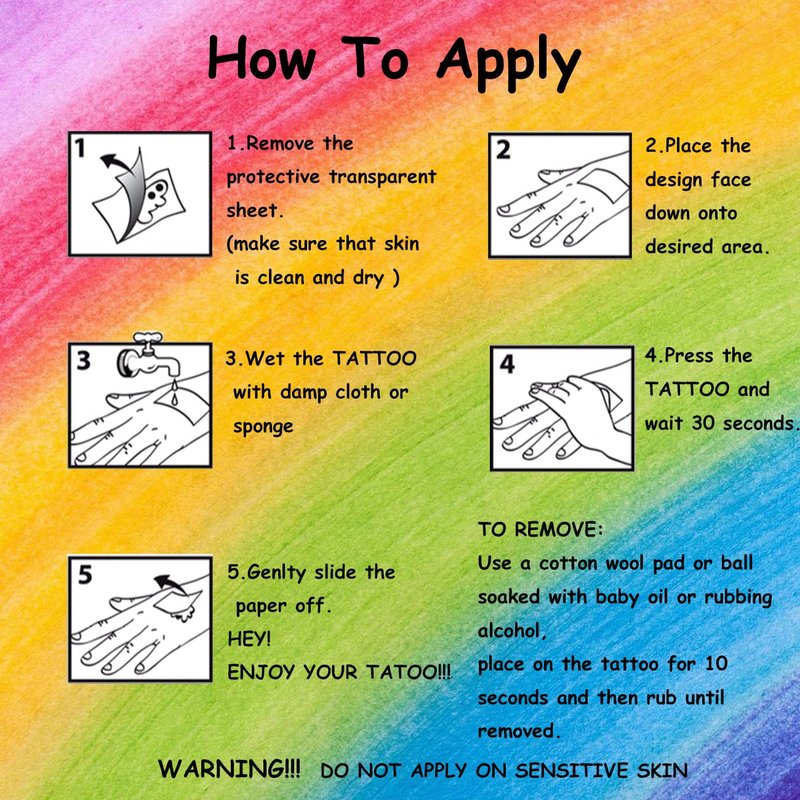 - ⚡Kids Rainbow Party Tattoos -- Our rainbow tattoos are safe for your little ones,each tattoo is made of standard quantity material and green paper, which is safe and non-toxic. These are kids removable temporary tattoos! With these fake tattoos, your kids can deck themselves out with colourful designs that wash or peel off later. Have fun with our collection of removable, temorary tattoos for kids.