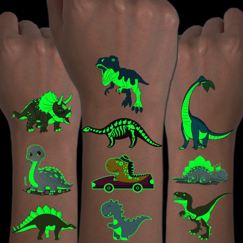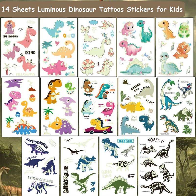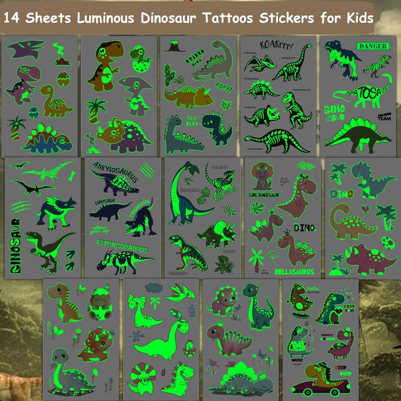 - ⚡14 Sheets Luminous Dinosaur Tattoos for Boys -- 110 PCS luminous tattoos total in 14 sheets to be easily included in a party gift bag. Easy to share,even if a lot of people's parties, you can have a different tattoo with others.These adorable tattoos will keep you and your little ones – and their friends – occupied for a while. Great for playdates, parties, or rainy days.