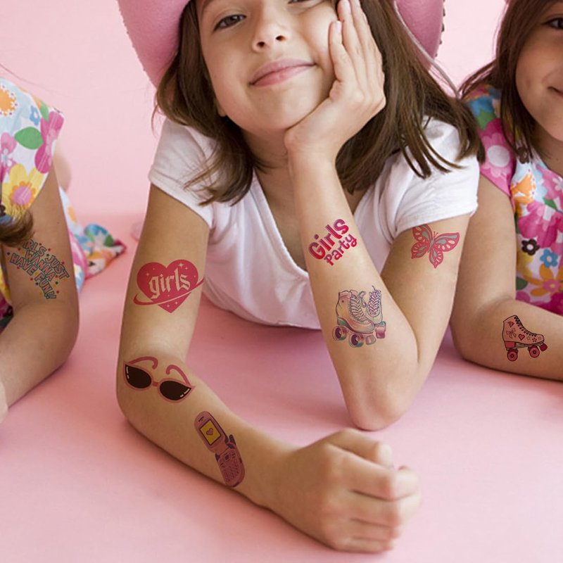 - ⚡Pink Girls Tattoos for All Occasions -- These awesome tattoos can be used in various occasions, such as birthday party supplies, party decorations, retro pink party favors, party bags, DIY decorations, pool and the beach or gift for kids and rewards. Kids temporary tattoos are the best party favors and goodie bags fillers ever for any kind of celebration!