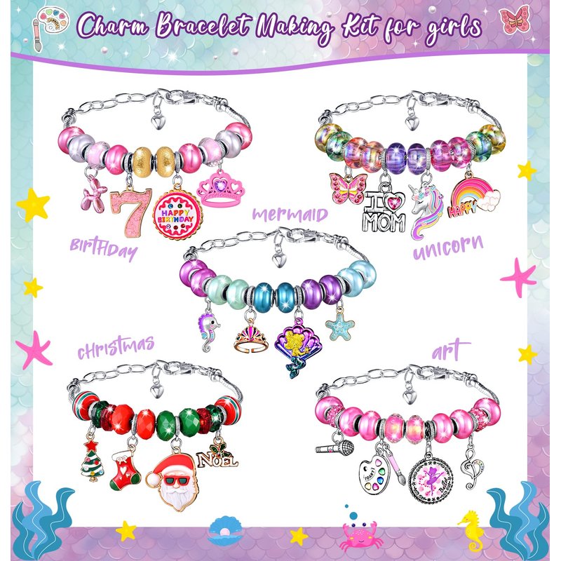 - Charm is power, and magic is art. A gift that inspires, and creativity unleashes! Charms bracelets set makes a perfect birthday or Christmas gift for 6 7 8 9 year old girls who enjoy jewelry making. This jewelry art kit is a hit at parties and it comes with everything needed to create personalized, unique bracelets. Be ready to wow her with this DIY bracelet making kits on her special day!