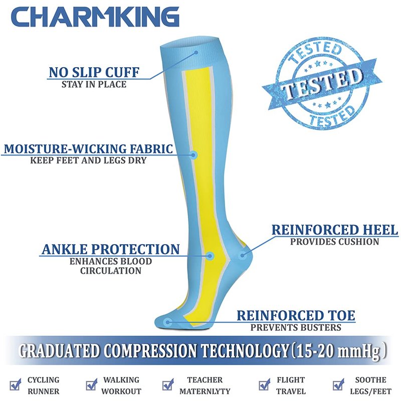 - COMFORTABLE MATERIAL AND CAREFUL CONSTRUCTION - CHARMKING knee high compression socks' material are upgraded with nylon percentage from 40% to 85%, Delivers 360-degree stretch for greater flexibility and durability. Breathable high performance fabric keeps an optimal temperature. We are confident that you will choose it!