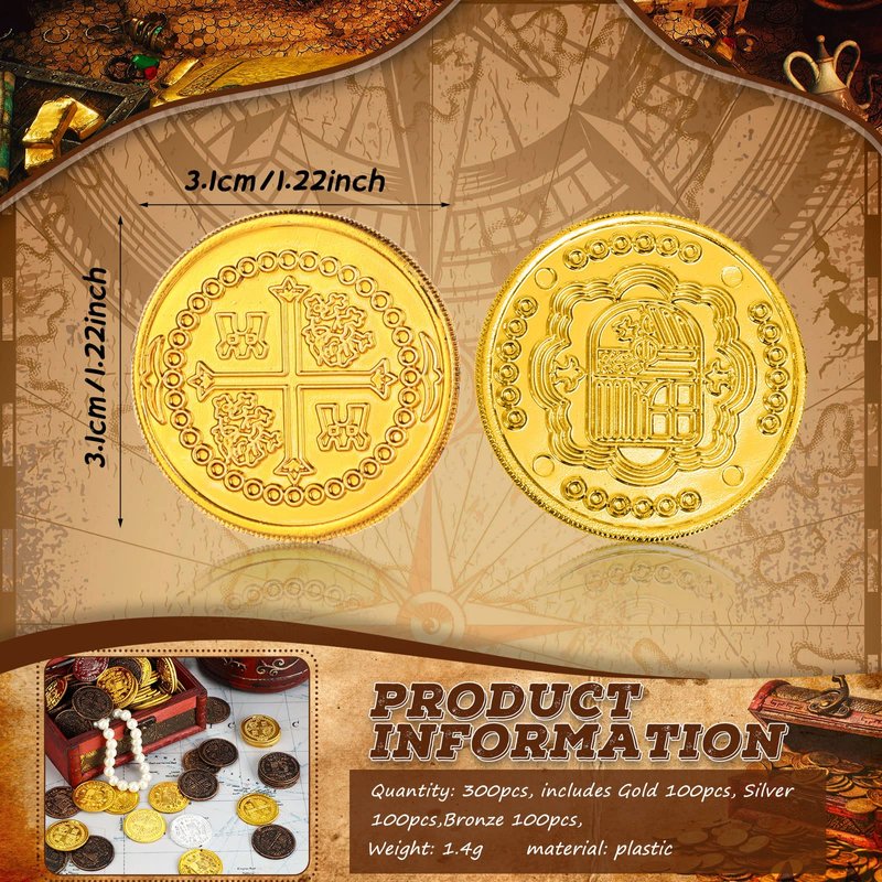 Features: Pirate coins sets are very suitable for pirate parties, Halloween parties, Christmas parties, birthday parties, cosplay, stage performance and so on. Made of quality material, the pirate treasure coins are lightweight and glossy, the surfaces of them are engraved with patterns, looks beautiful and realistic, they are reusable and long lasting. Specification: Material: plastic Size: approx. 3.1 cm/ 1.22 inches in diameter Weight: about 1.4 g Color: gold, silver and bronze Package includes: 300 x Small gold coins Note: Please allow slight size error due to manual measurement. The colors may exist a slight difference due to different screens.