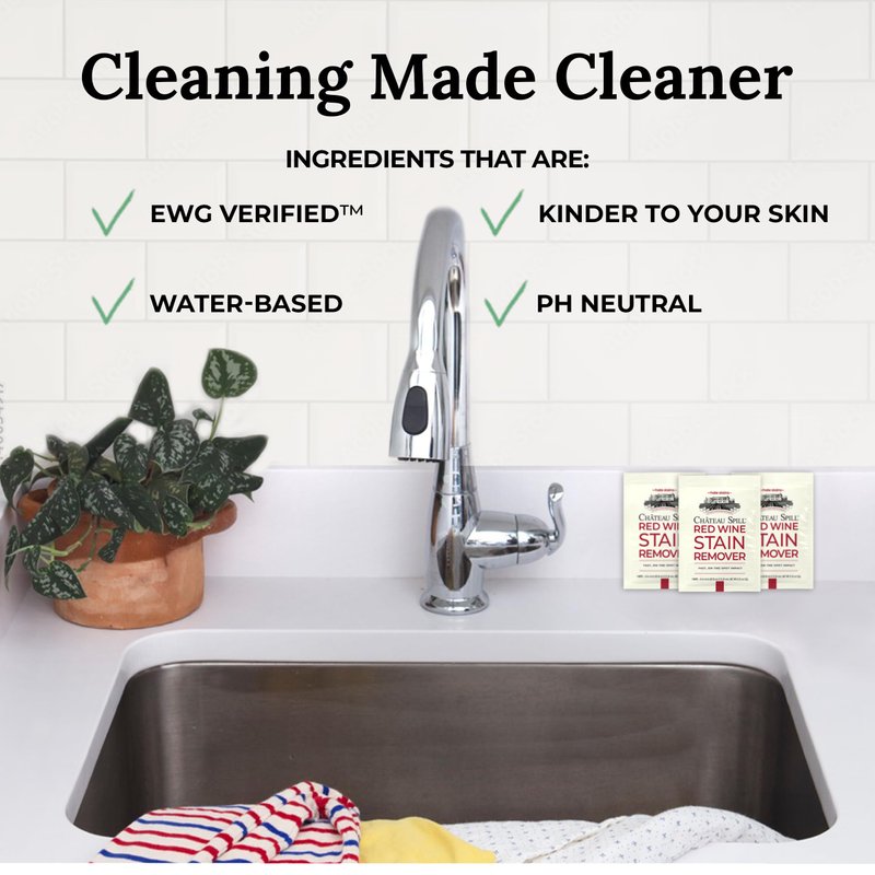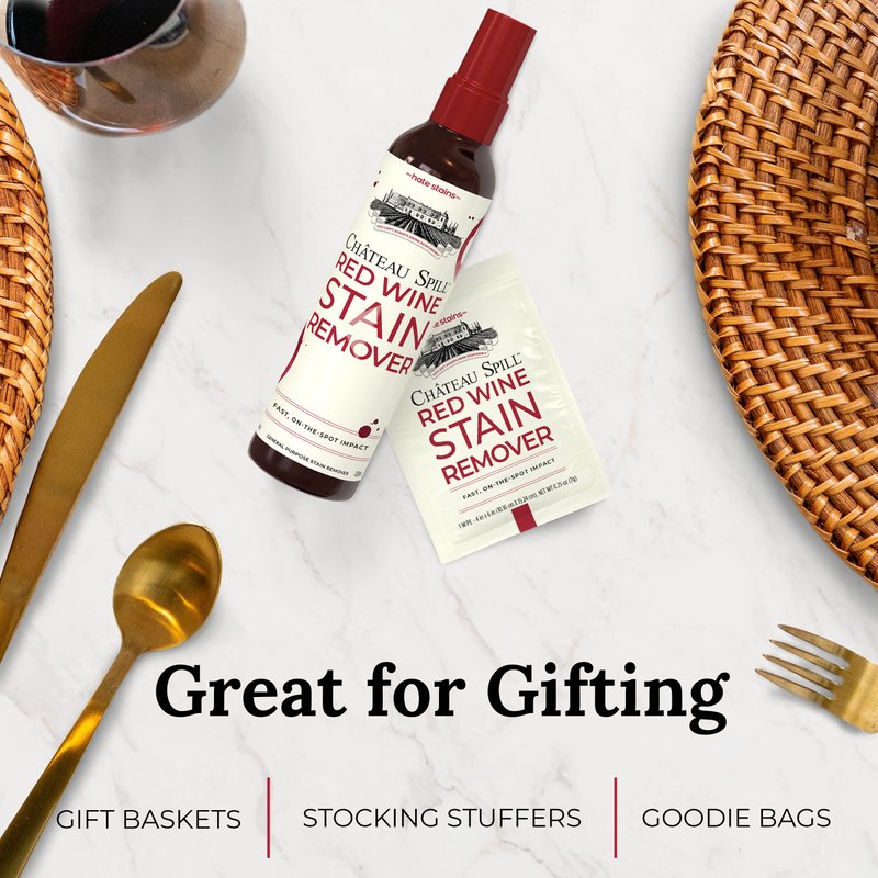 Chateau Spill Red Wine Stain Remover Chateau Spill Red Wine Stain Remover is a super-concentrated stain remover designed to quickly and safely treat stains when they occur. The professional grade formula uses more surfactants than other national brands making a little go a lot further. Made to live where the accidents happen so you can starts working immediately to break up stains. Chateau Spill is safe and effective on all colorfast washables. Made for where the action happens. . Every Stain Is Different Some stains will come out on contact. For others you can activate the stain-fighting power by rubbing in the formula while being careful to protect the texture of the fabric by not scrubbing too hard. If needed you can wait five minutes for the professional grade formula to do its work. Real tough or dry stain stains? You can douse with water and let soak to loosen stain. Then blot and spray formula. You can rinse off. Then place the clothing in the washing machine as you normally would. . Safe on Colorfast Fabrics To ensure your clothes are colorfast, first check their labels. Labels that read "wash separately," "wash in cold water," "hand wash," "do not use detergent," or "turn inside out to launder" may indicate the dyes are not colorfast. To test, soak an inconspicuous corner of the material in a cup of warm water and a teaspoon of detergent for two to three minutes and then blot with a white paper towel. If the colors do not change, run, or come off on the paper towel, you may safely use Chateau Spill Red Wine Stain Remover. . Tips and Tricks for Fighting Stains The longer a stain remains on fabric, the more difficult it will be to remove. Deal with spills as soon as you can by keeping a bottle of Chateau Spill or Wipes where the accidents happen. You can douse a spill with cold water and then blot dry.