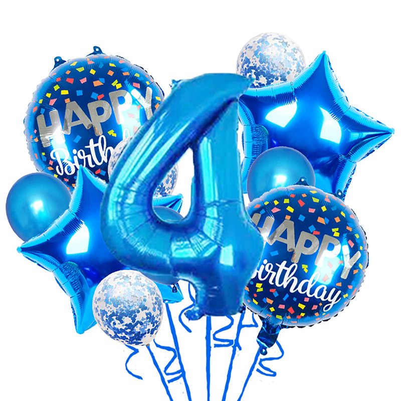- Package comes with 1pc 32 inch Number 4 Foil Mylar Balloons, 2 pcs 18 inch Letter Balloon, 3 pcs 12inch blue latex balloon, 3 pcs 12 inch blue confetti balloon, 2 pcs 12inch stars,1 ribbon.