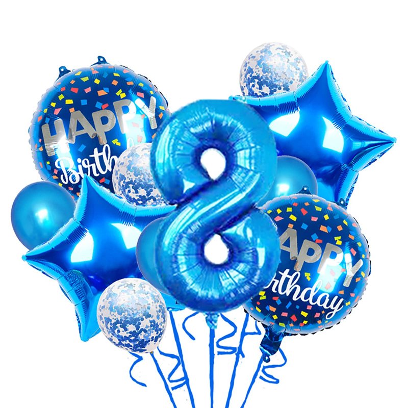 - Package comes with 1pc 32 inch Number 8 Foil Mylar Balloons, 2 pcs 18 inch Letter Balloon, 3 pcs 12inch blue latex balloon, 3 pcs 12 inch blue confetti balloon, 2 pcs 12inch stars,1 ribbon.
