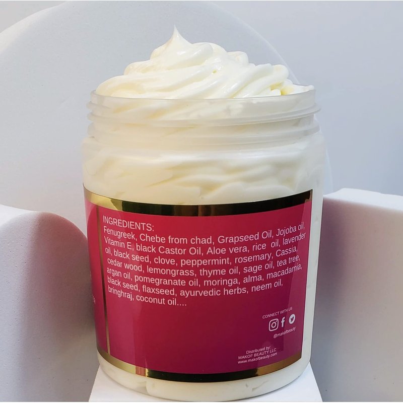 - INGREDIENTS THAT GET THE JOB DONE. All MAKOF BEAUTY products are carefully formulated to nourish your hair health. We use all naturals and organics good stuff in and leave the bad stuff out. Shea butter, Mango butter, Cocoa butter, Rosemary, Fenugreek, Castor oil, Macadamia oil, Chebe the list goes on and on. We are always looking for the quality.