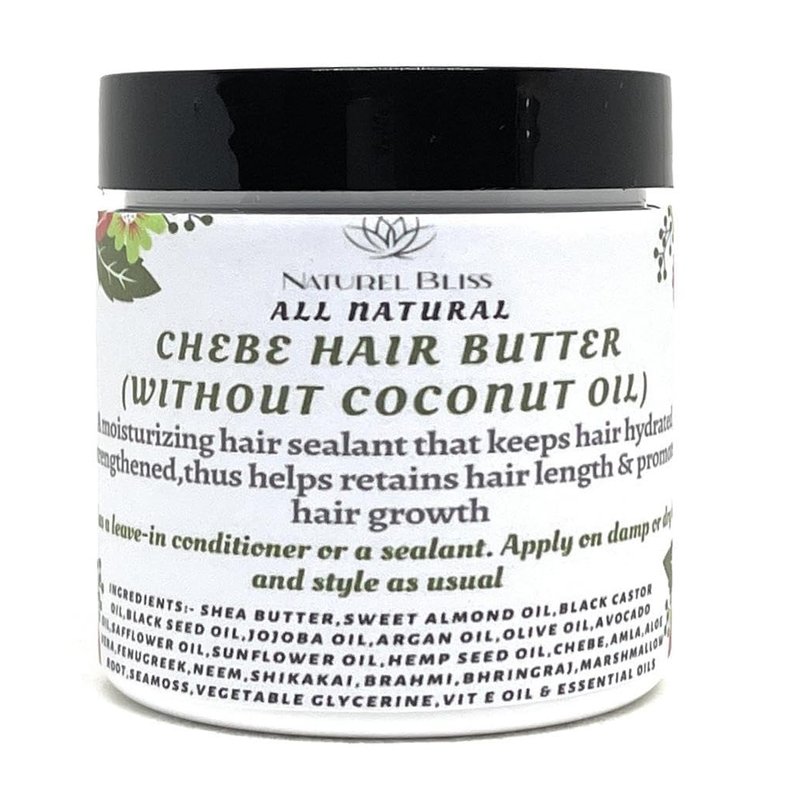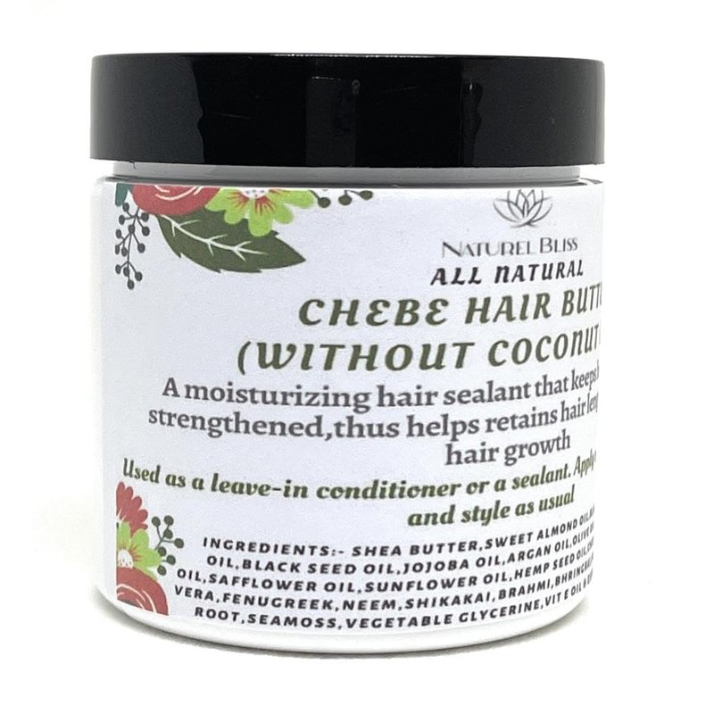 - Our Chebe Hair Butter is made with 100% unrefined Shea Butter, Chebe powder, Amla Powder, Fenugreek,Marshmallow root powder, seamoss powder, Neem, shikakai, bhringraj, Aloe Vera, And Nourishing Carrier Oils(Karkar oil, sweet almond oil, Jamaican Black Castor Oil, Hemp oil,Black seed oil, Olive oil, Sweet almond oil...).