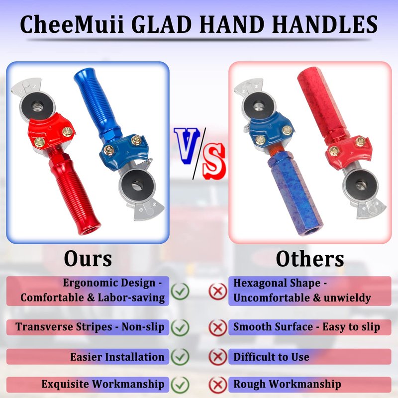 - 【FUNCTION】--- The glad hand handles conforms to the principle of ergonomics and is more labor-saving. Seals are made of high-quality rubber, strong air tightness, air leakage prevention. Gladhands kit is color coded red & blue for easy identification.