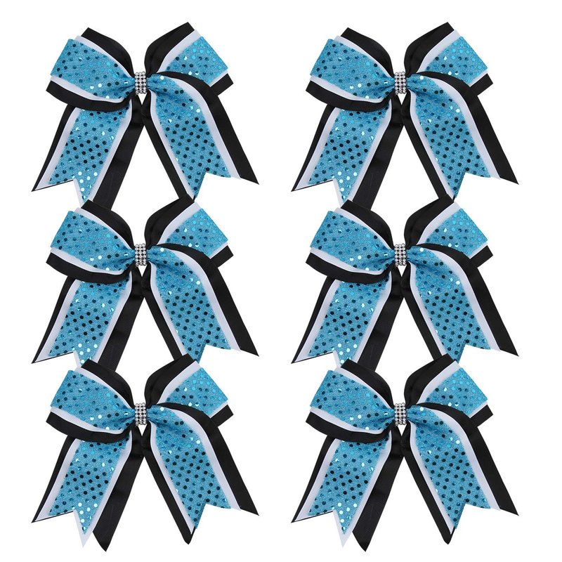 Cheerleader Bows 8 Inch 3 Layers 6 Pcs Ponytail Holder Jumbo Cheerleading Bows Hair Elastic Hair Tie for High School College (Black/White/light bright blue))