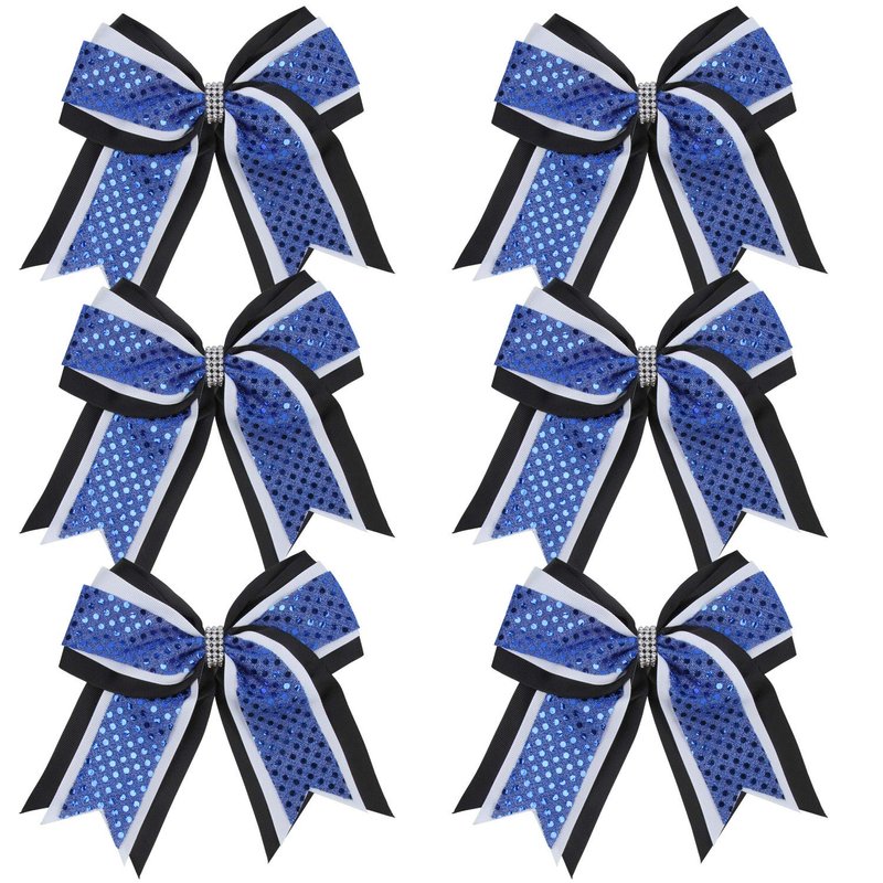Cheerleader Bows 8 Inch 3 Layers 6 Pcs Ponytail Holder Jumbo Cheerleading Bows Hair Elastic Hair Tie for High School College (Black/White/Royal Blue)