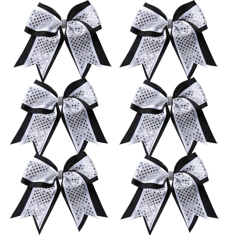 Cheerleader Bows 8 Inch 3 Layers 6 Pcs Ponytail Holder Jumbo Cheerleading Bows Hair Elastic Hair Tie for High School College (Black/White/Silver)