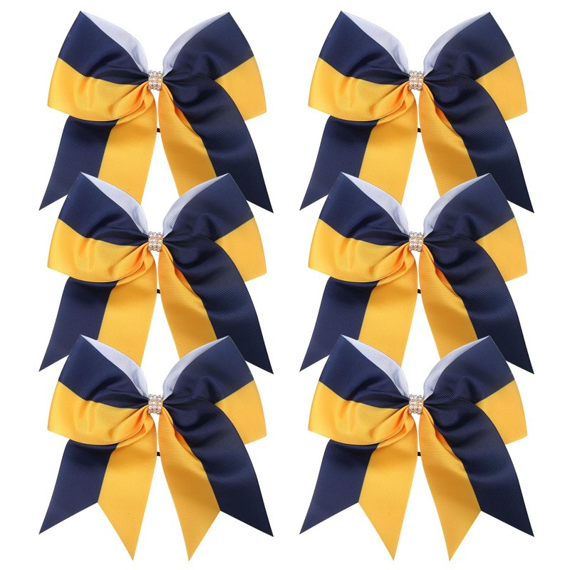Cheerleader Bows 8 Inch Comb Color Ponytail Holder with Bling Fling Rhinestones Hair Tie Cheerleading Bows 6 Pcs (Navy Blue/Gold)