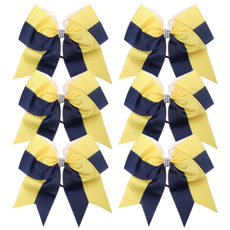 Cheerleader Bows 8 Inch Comb Color Ponytail Holder with Bling Fling Rhinestones Hair Tie Cheerleading Bows 6 Pcs (Navy Blue/Yellow)