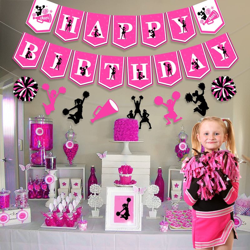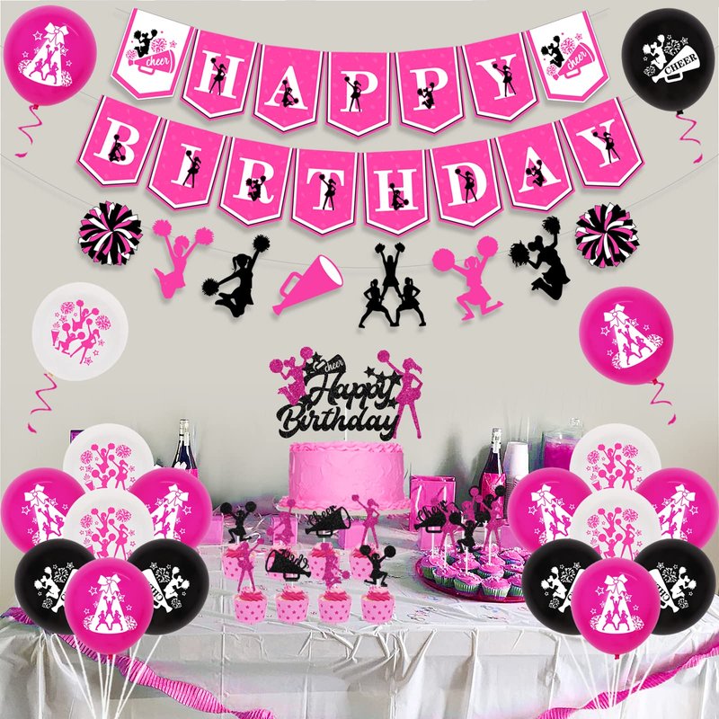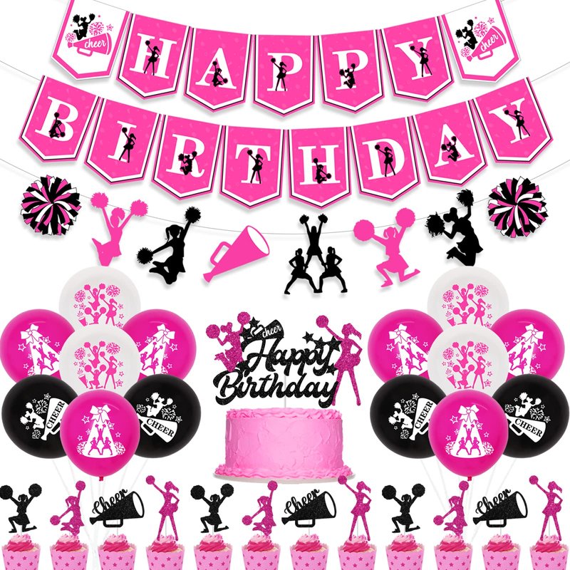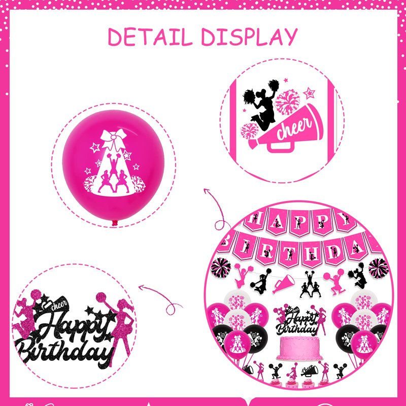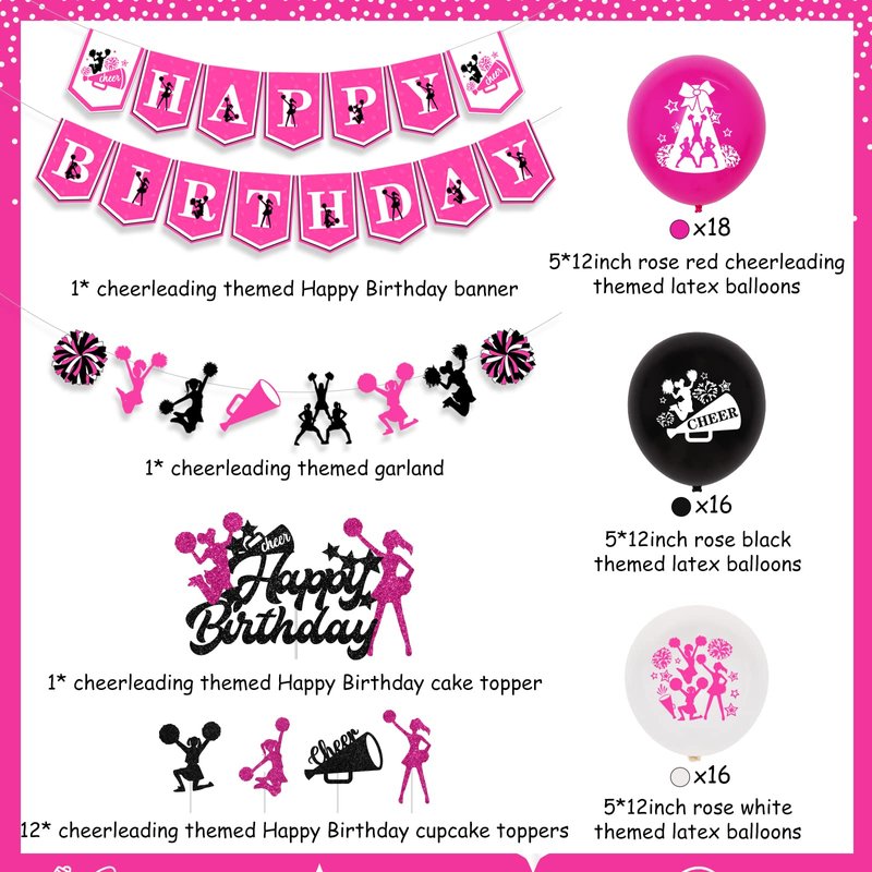 - You will get: 1* cheerleading themed Happy Birthday banner; 1* cheerleading themed garland; 1* cheerleading themed Happy Birthday cake topper; 12* cheerleading themed Happy Birthday cupcake toppers; 5*12inch rose red cheerleading themed latex balloons; 5*12inch white cheerleading themed latex balloons; 5*12inch black cheerleading themed latex balloons