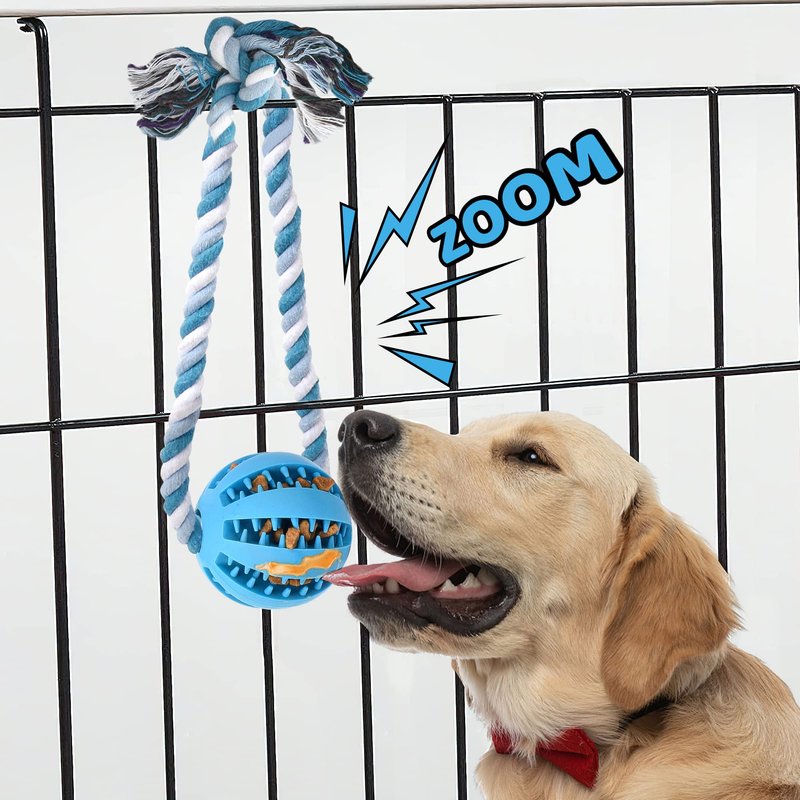 - Food Dispenser Toy:Spread peanut butter on the ball, stuff the dog food inside the ball, then tie the rope to the cage, the dog can get the food by licking or turning the ball with the nose, making it more fun to get food.