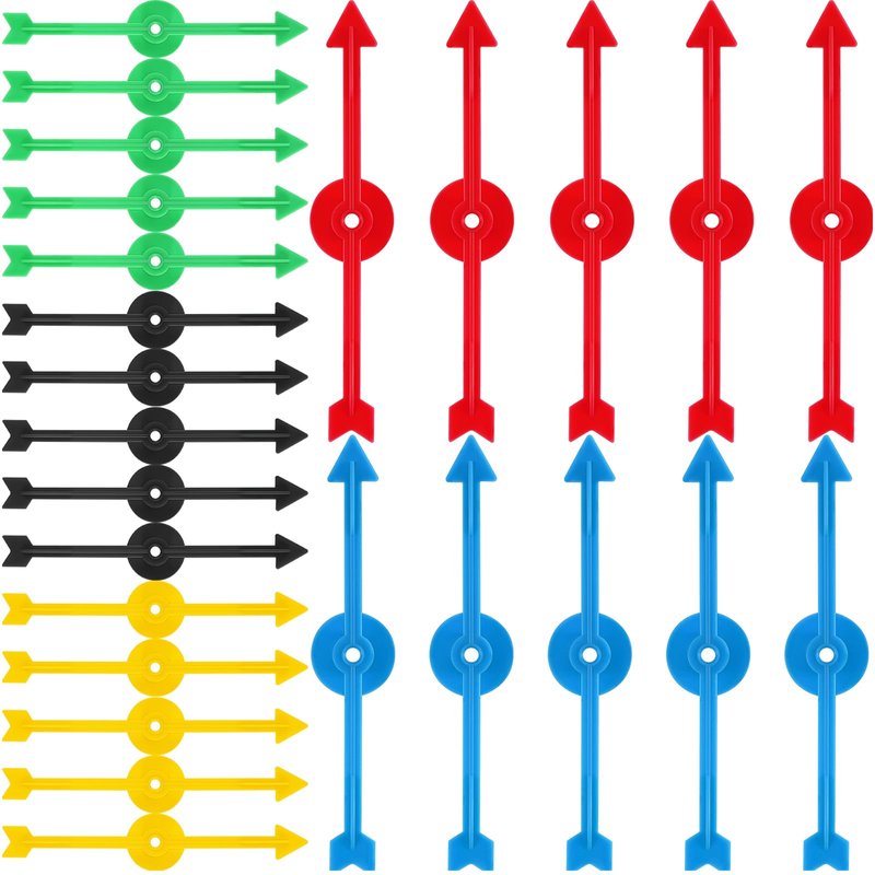 4 Inch arrow game spinners arrow spinner in 5 color for school, board game spinner (25 pieces)Multi color: Comes in 5 assort colors, red, yellow, green, blue and blackMulti-function: The game spinner can stick to the rotatory because the rotatory is flat, or make a hole then installed on the rotatory plate. These game spinners can replace those broken board game spinners, or other standard spinners. The game spinner often use in classroom for teaching colors, letters, numbers, math, vocabulary, language, music, history, probability experiments, etc. It will make your class funny and unforgettable. Wide applications: The arrows can be worked with paper, card-stock, shoe-box weight cardboard, cardboard, paper plates, laminated card-stock, etc.Specifications: Color: red, yellow, green, blue and blackMaterial: plastic Size: 4 inchPackage includes: 25 x Plastic arrow spinner1 x Paper box