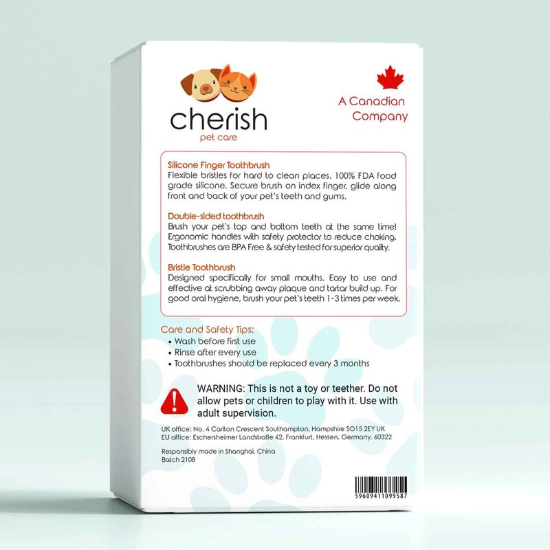 Let us help you! Cherish Pet Care has made the ideal toothbrush kit for your fur baby. We want to make it easy for you to care for your pet's dental hygiene. With that in mind, we made an awesome 3-piece set, so brushing will always be a pleasant experience for both parties. These toothbrushes for small dogs and cats fit perfectly in their little mouths without causing any discomfort. To produce this kit we made sure to only use pet-friendly materials because we know that you want the best for them. If your fur baby is new to brushing, you can start with the finger brush. Once they are acclimated, move on to the nylon or silicone toothbrushes as needed. Using these toothbrushes on your dog or cat gives them the best chance of staving off gum or teeth-related issues like tartar build-up, gingivitis, or bad breath. We help you so you can help them.