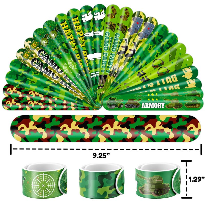 š„³ćDELIGHTFUL MILITARY PARTY FAVORS BUNDLEć: Get ready for laughter with our set of 24 temporary tattoo stickers and 24 slap bracelets. Each piece showcases vibrant and adorable designs inspired by the Military theme. Perfect for both kids and adults, this bundle ensures endless fun. The bracelets measure 23.5cm x 3.3cm, providing a satisfying "slapping" experience as they effortlessly wrap around your wrist. šæćDURABLE AND COMFORTABLEć: Constructed from high-quality materials, our slap bracelets are built to withstand wear and tear. The sturdy metal core is encased in soft PVC, ensuring safety, comfort, and longevity. With a smooth surface and no sharp edges, these bracelets offer a gentle and enjoyable feeling on your skin. Designed for daily use, they maintain their vivid colors and shape, adding a charming and nostalgic touch to your accessory collection. šćEFFORTLESSLY STYLISHć: Embrace the simplicity and trendiness of wearing our slap bracelets. With just a gentle "slap," they wrap around your wrist effortlessly, creating a comfortable and stylish look. Lightweight and comfortable for extended wear, they're perfect for parties, special occasions, or everyday fashion. These accessories bring a playful charm to any gathering, capturing the joyful spirit of the Military theme. Let the festivities begin! šæćVERSATILE AND PORTABLEć: Take the fun with you wherever you go with our versatile slap bracelets. Their compact and lightweight design allows for easy carrying in your pocket, purse, or backpack. Whether at school, work, or social gatherings, wearing them instantly adds a lively and fashionable touch to your outfit. With their playful and nostalgic appeal, these bracelets are sure to attract attention and bring smiles wherever you venture. Get ready! šćPERFECT GIFT FOR MILITARY ENTHUSIASTSć: Our Military Temporary Tattoos and Slap Bracelets are the perfect gift for people of all ages, from kids to adults. Suitable for any occasion, they offer an affordable and delightful option. Whether for school events, birthdays, or stocking stuffers, this Military themed collection adds a fashionable and nostalgic element to anyone's accessory collection, invoking happiness and cherished memories.