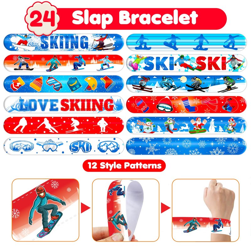 Cherisnowy 48 Skiing 24PCS Skiing Temporary Tattoos Sticker 24PCS Slap Bracelets Perfect for Themed Birthday Party Favors Baby Showers or Classroom Rewards Ideal Decor and Gifts for Girls and Boys