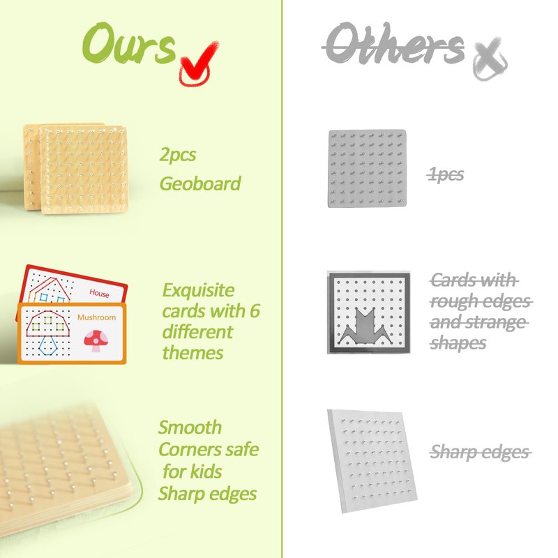 - 【Competitive Advantage】:2Pcs study wooden geoboards with 40pcs unique designed cards and 60pcs rubber bands make its can be played by two or more kids togeter,Kids can learn number,animals,flowers easily with these unique designed cards .it allow your kid to develop his imagination by creating multiple geometric shapes and patterns. Keep your kids occupied everywhere: while traveling, in the car, at home, at school, or in kindergarten