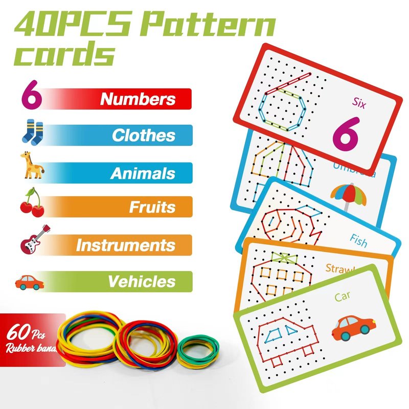 Kids will create new patterns with different-sized, multicolored rubber bands!Good for kids who love making shapes, arabic numbers,letters, designs and struggle with grasp, fine motor & visual motor skills.Funny teaching tools to improve kids creations and imaginations