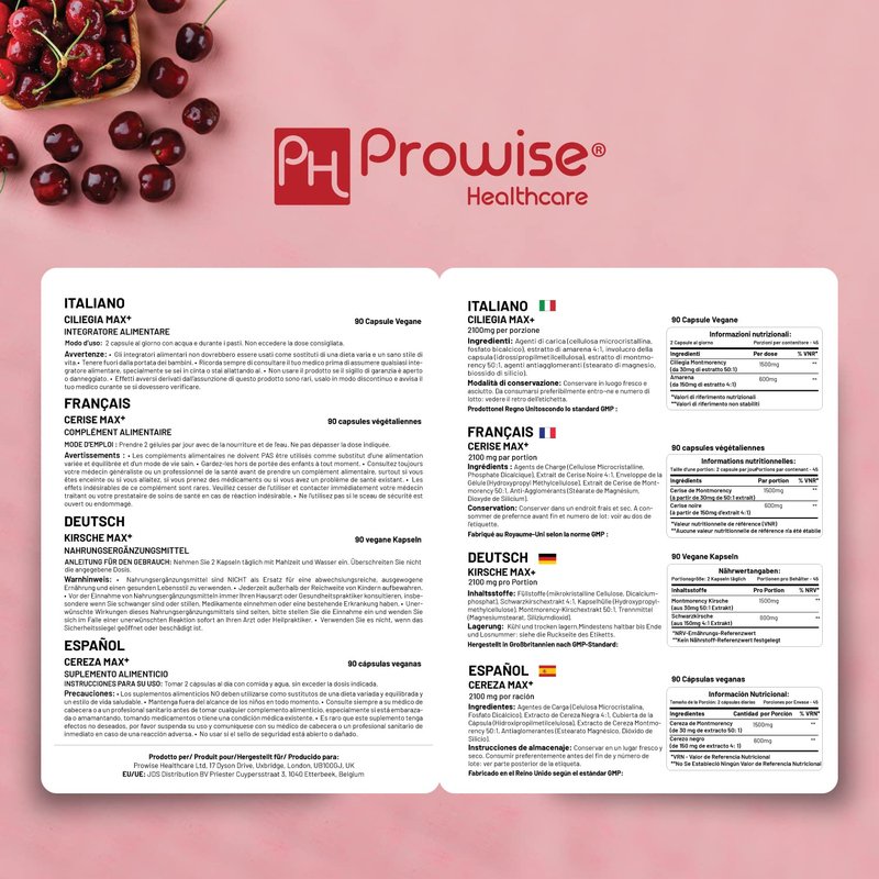Cherry Max+ 2100mg Montmorency Cherry Added with Black Cherry I 90 Vegan Capsules High Strength I Made in The UK by Prowise Healthcare