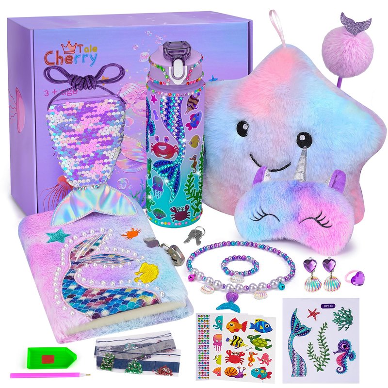Cherry Tale Mermaid Gifts for Girls Age 4 5 6 7 8 9 10, Girls Mermaid Birthday Gifts Set with Light Up Star Pillow Diary Plush DIY Water Bottle Kits Christmas Presents Toys