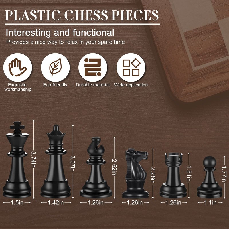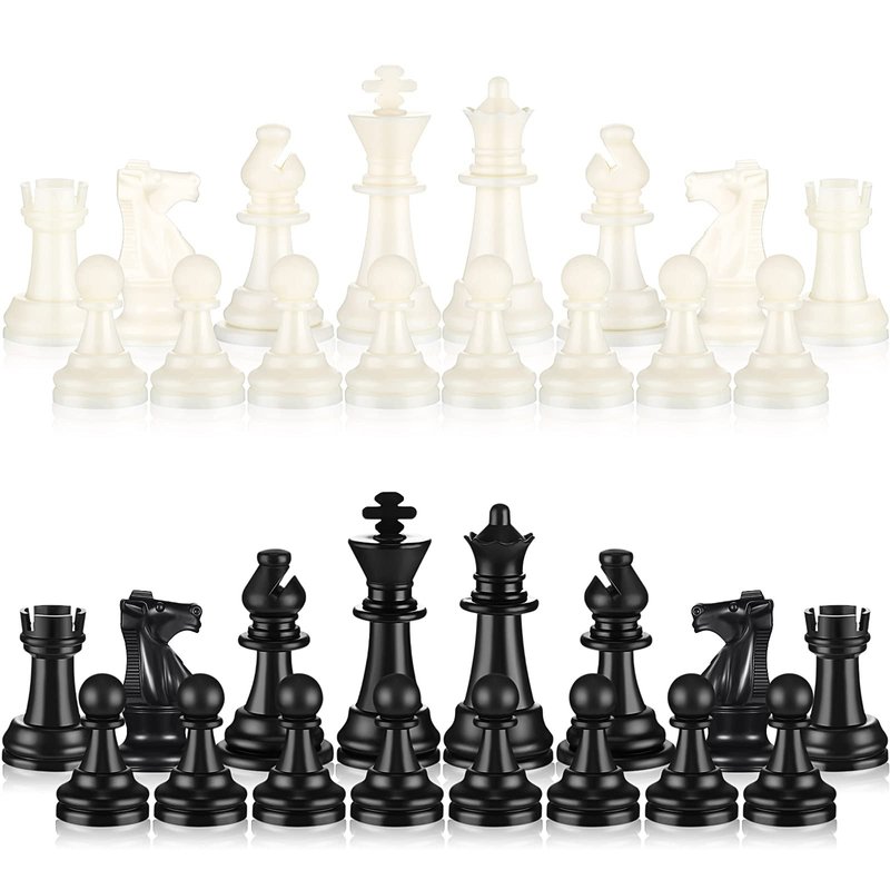 - Appropriate size of the plastic chess: the height of king is approx. 3.7 inches, and the he rests - queen, bishop, knight, pawns are in proportion; There are 32 pieces full-size pieces set included (1 set), ideal for applying as a complete set of replacement pieces, counting chips during classics like the sorry board game, educational games, birthday parties, etc.
