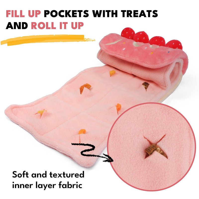 Indulge your furry friend's senses with our whimsical-designed puzzle toy that resembles a luscious cream and strawberry cake. Delightful and appetizing, its realistic strawberry design atop the cake is sure to catch your pup's eye and get their tail wagging with excitement. Beneath the surface is where the real fun lies. With ten hidden treat pockets, your pooch won't be able to resist the lure of uncovering a tasty reward. It's an excellent way to keep them entertained and engaged, whether it's their special day or simply a regular afternoon. What's more, the strawberry roll cake nose work toy has a delectable scent that will get your dog sniffing and nuzzling, increasing their playtime with the toy. With its combination of charming design, stimulating puzzle, yummy treats, and irresistible aroma, this toy guarantees hours of play and happy moments for your furry best friend.
