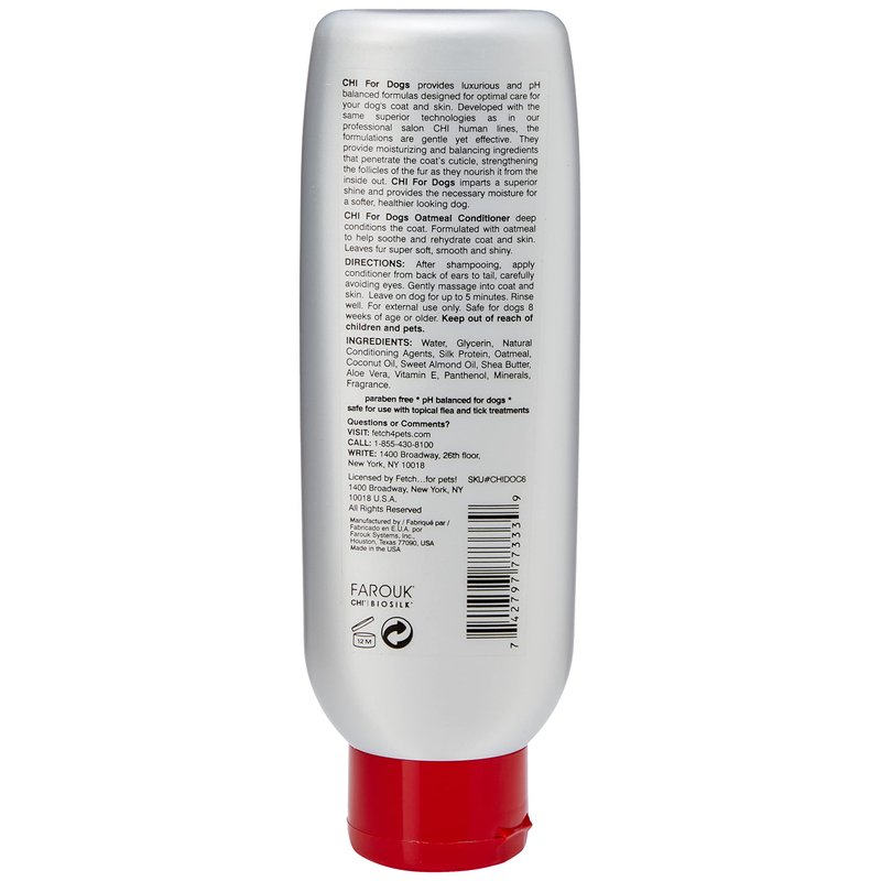 - Deep conditions the coat — CHI for Dogs oatmeal Conditioner deep conditions the coat. Formulated with Oatmeal to help soothe and rehydrate the coat and skin. Leaves fur super soft, smooth and shiny