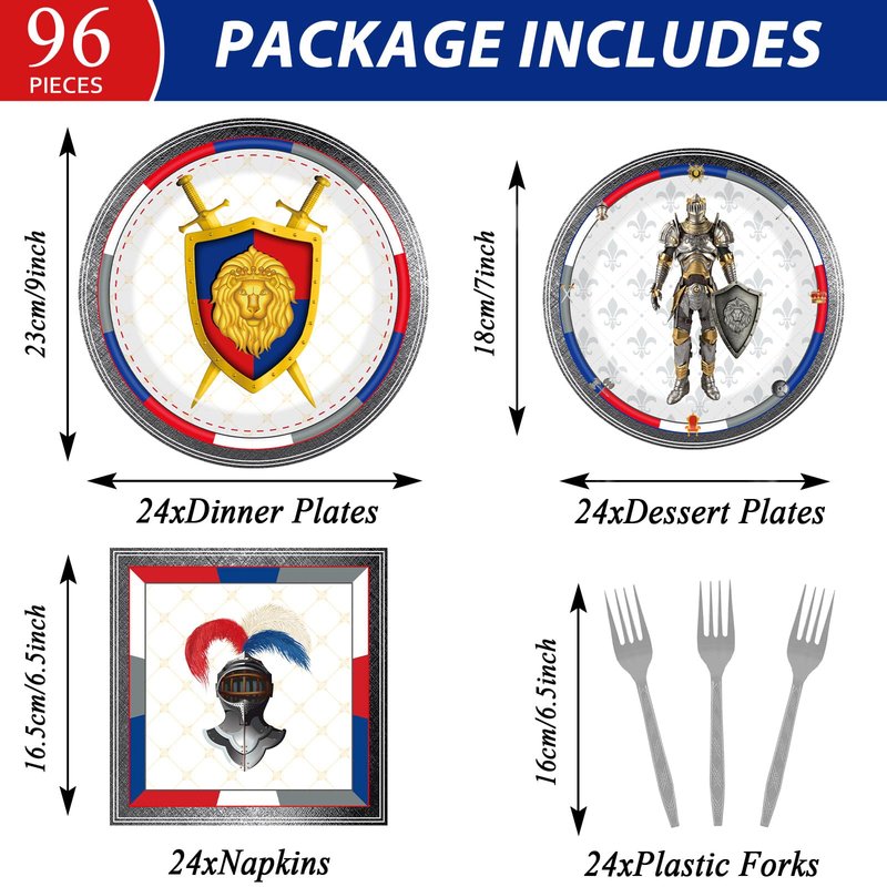- 【Package Includes】You will receive 24 pieces of Medieval Knights birthday party paper dinner plates of 9'',24 pieces of Knight Castle Birthday paper plates of 7'',24 pieces of Medieval napkins of 6.5'',and 24 plastic Silver forks for each set that can serve 24 guests.